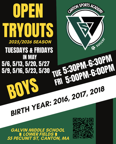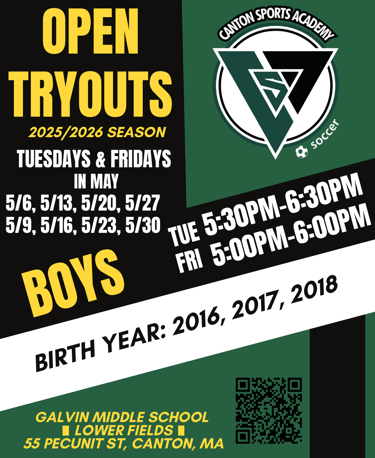 Our U9 and U8 BOYS teams Open Tryouts will be held on Tuesdays May 6th, 13th, 20th and 27th and Fridays May 9th, 16th, 23rd and 30th in Canton.