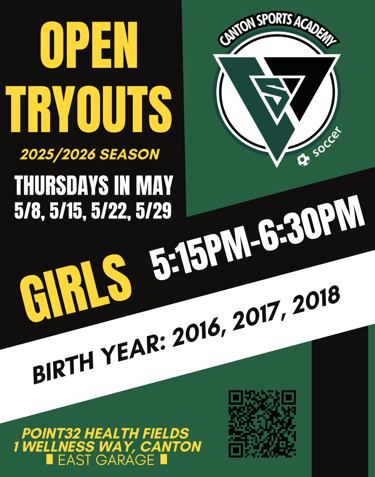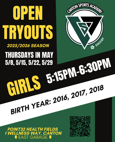 Our U9 and U8 GIRLS teams Open Tryouts will be held on Thursdays May 8th, 15th, 22nd and 29th in Canton.